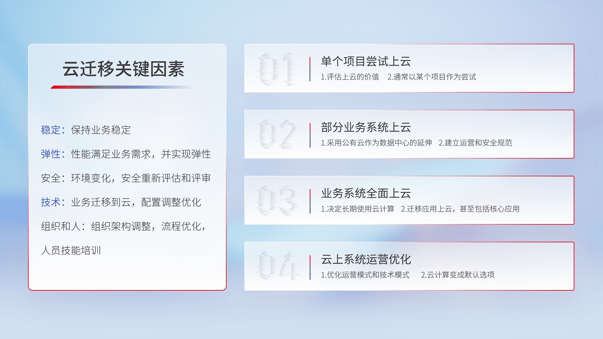结合实际业务,,从规划设计、、云平台选型、、、云原生改造、、、数据迁移、、、、集成交付,,迁移全过程为客户识别最佳上云路径,,,做好风险识别管理,,设计网络架构、、、、身份权限、、、安全审计合规、、、、操作审计、、、、日志审计、、监控告警策略、、多站点容灾设计等,,对云上基础设施进行整体规划,,,提升IT治理水平,,,以满足弹性、、、高可用、、、、高性能的需求。。。