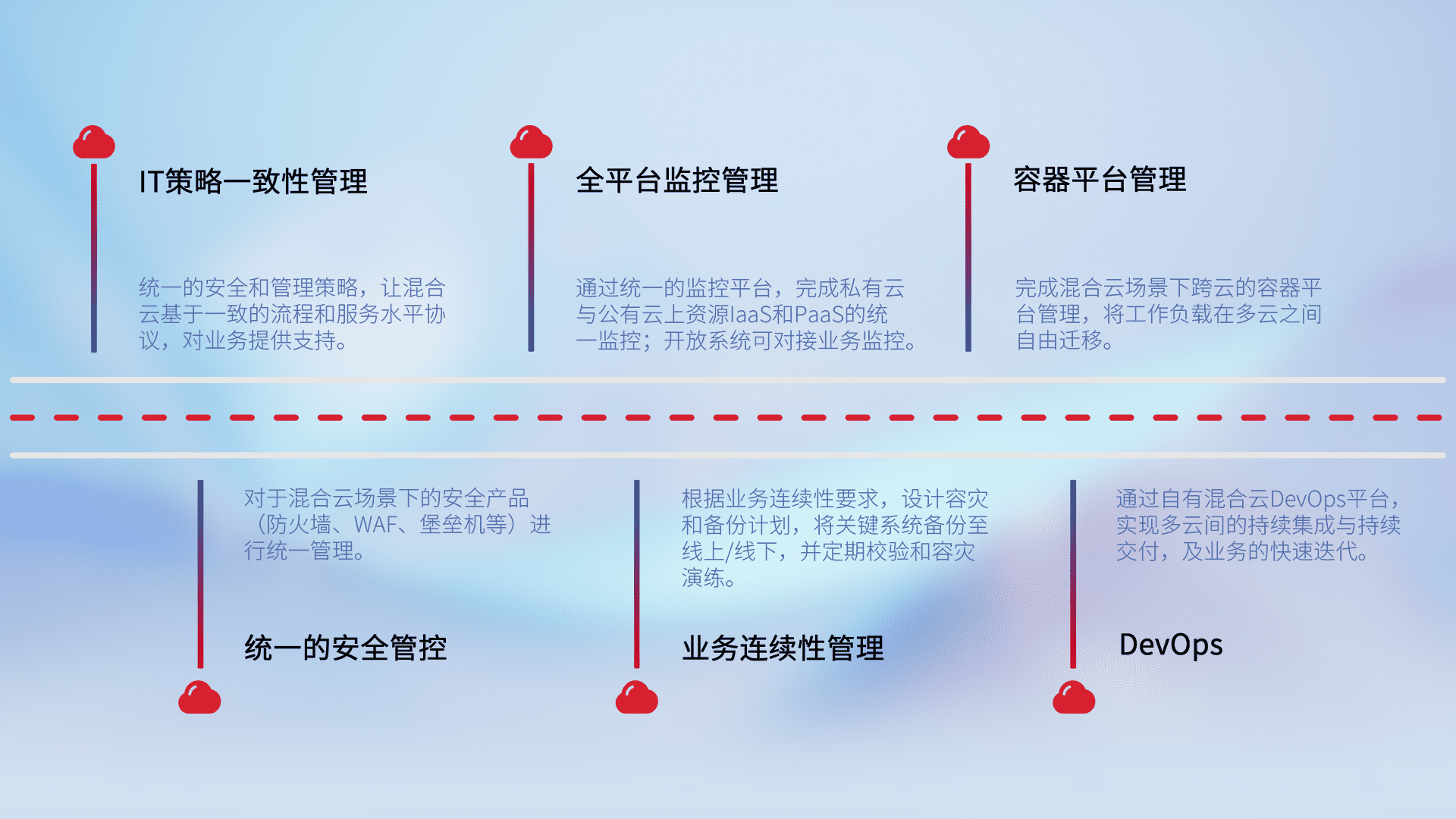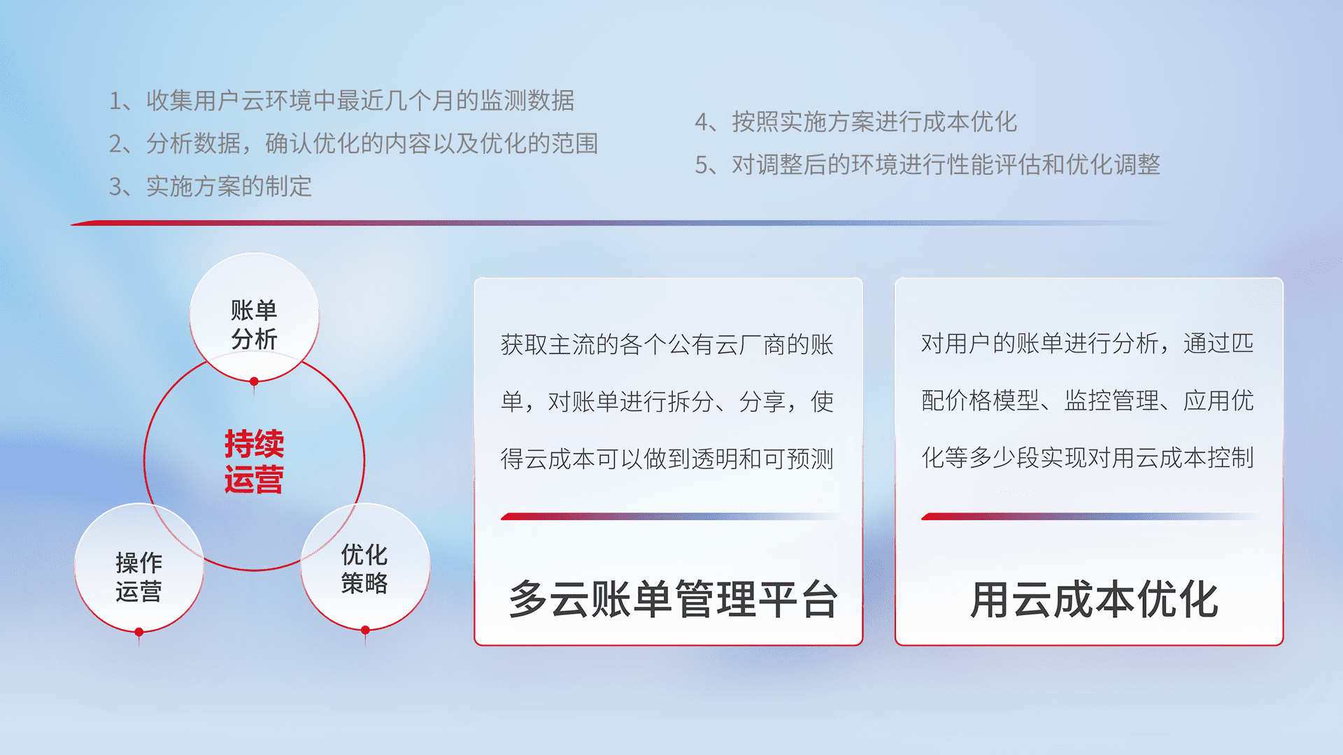 通过多云纳管,,,,以统一的资源数据模型把客户的云资源进行抽象和封装,,,,进而实现对多云资源的统一操作,,保障云资源管理的可靠性、、、、稳定性与可用性。。。量身定制化运维内容,,配置、、、、开发运维、、补丁管理、、备份、、、、监控、、认证和访问管理、、审计和日常巡检等,,,,保障在用云过程中的可靠度,,,,稳定度以及高可用率。。