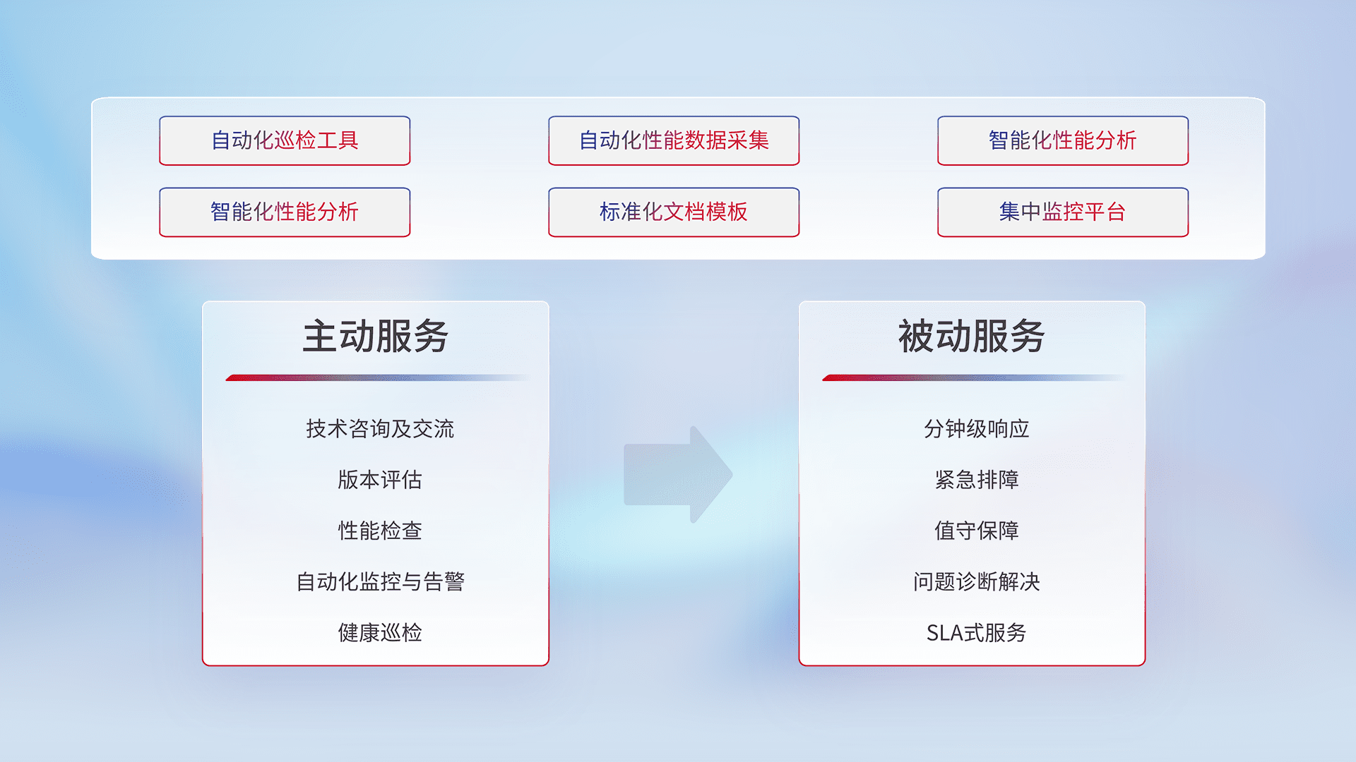 智能化工具和标准化文档,,,,保障服务质量,,,提供主动服务(包含技术咨询、、、、版本评估、、、、性能检查、、、、自动化监控与告警、、健康巡检)和被动服务包含(分钟级响应、、、、紧急排障、、、值守保障、、问题诊断解决、、、、SLA服务)。。。